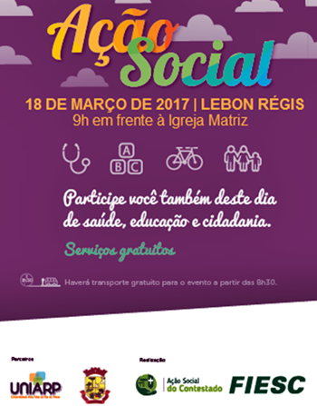 A comunidade de Lebon Régis e região terá, no próximo sábado (18), acesso a serviços gratuitos nas áreas de saúde, educação e cidadania. A ação social, promovida pelo SESI, entidade da FIESC, será realizada neste sábado, dia 18, das 9 às 15 horas, em frente à Igreja Matriz do município. Haverá transporte gratuito para deslocar a população até o local do evento. Mais informações pelo telefone (49) 3561-1216.