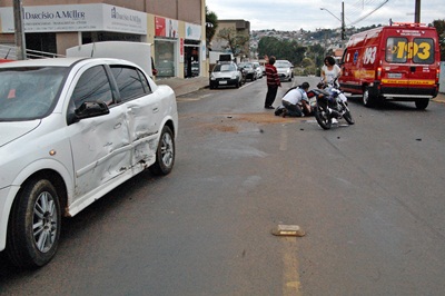 Um motociclista ficou ferido na tarde desta terça-feira, 25 de abril, após se envolver num acidente de trânsito na Rua Moacir Sampaio, próximo ao Sine. Ele teve a frente cortada por um GM Astra, que realizava uma conversão sobre a via.