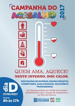 A Campanha do Agasalho 2017 que é uma iniciativa da Prefeitura de Caçador, através da Secretaria de Assistência Social, Defesa Civil e o Tiro de Guerra 05-006, juntamente com as entidades parceiras, iniciou na sexta-feira, dia 12 de maio. Ao todo, serão 24 pontos de coleta, para onde as doações poderão ser encaminhadas.
