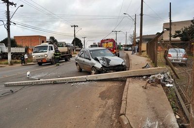 Um veículo bateu e derrubou um poste de energia elétrica na tarde desta quarta-feira, 21 de junho, próximo a Santelmo Veículos, na rodovia Honorino Moro em Caçador. O condutor Adilson dos Santos, 36 anos, foi preso em flagrante por dirigir embriagado.