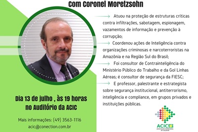 A Associação Empresarial de Caçador (ACIC) realiza dia 13 de julho a palestra: “Boas Práticas de segurança para empresários e para as famílias”, com o coronel Eugênio Moretzsohn da Nóbrega Cesarino. A palestra é gratuita e será realizada às 19 horas no Auditório da ACIC.