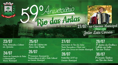 O principal destaque da semana do município é o show de João Luiz Correa, que será realizado no dia do aniversário do município, 27 de julho. Entretanto, haverá o retorno de um velho conhecido da cidade, o Festival da Música rioantense, FestimRio, onde a população terá a oportunidade de apresentar seu talento musical. Este evento só aceitou inscrições de munícipes de Rio das Antas.
