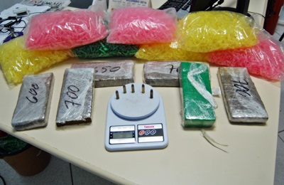 No interior da residência, os policiais encontraram 3,863kg de maconha; aproximadamente 10 mil pinos de plástico que geralmente são usados para embalar cocaína; uma balança de precisão e cinco munições de revólver calibre 32.