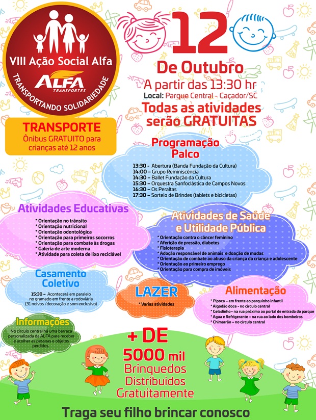 A empresa Alfa Transportes realiza no dia 12 de outubro, Dia das Crianças, a 8ª edição da Ação Social Alfa. O evento sem fins lucrativos terá diversas atrações voltada a criança e as famílias.