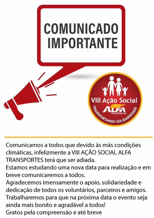 A Ação Social da Alfa Transportes, em que a Prefeitura de Caçador é parceira, foi adiada devido à instabilidade climática. O evento aconteceria nesta quinta-feira, 12 de outubro no Parque Central.