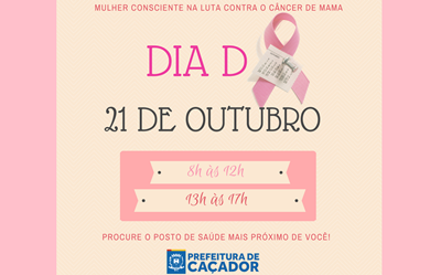 A Secretaria de Saúde de Caçador realiza o dia D da campanha Outubro Rosa no sábado, 21. Os atendimentos acontecerão das 8h até às 12h, retornando às 13h30 e encerram às 17h. Durante o dia, serão realizados procedimentos voltados à saúde da mulher como a coleta de preventivo e orientações para o autoexame.