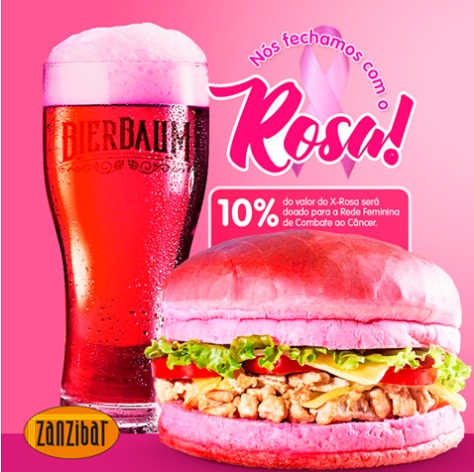 Se você também quer contribuir, vá até o ZanziBar e peça o X-Rosa, um lanche delicioso de peito de frango com catupiry, tomate, alface e queijo servido em um charmoso “pão cor de rosa”.