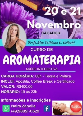 A FisioEstét realiza nos dias 20 e 21 deste mês de novembro, em Caçador, um Curso de Saúde Inegrativa, voltado para a Aromaterapia. As aulas serão ministradas pela Professora.Msc. Tathiana C. Gelinski, de Florianópolis.