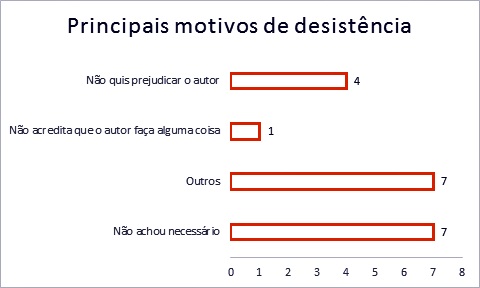 A partir dessa nova modalidade de atendimento, 60 mulheres já receberam o atendimento psicológico, momento em que puderam decidir se a medida protetiva seria o mais adequado para o seu caso, e se tinham interesse em representar criminalmente (quando possível) contra o agressor. Dessas 60 mulheres, 23% decidiram que a Medida Protetiva não seria a solução mais adequada, e 32% optaram por não representar criminalmente contra os agressores. Como os principais motivos de desistência tem-se aquelas que, após o atendimento psicológico, entenderam que medida protetiva não seria necessária naquele momento, aquelas que não acreditam que o autor continuaria fazendo algo contra elas, e aquelas que queriam evitar que o autor respondesse criminalmente. O gráfico a seguir permite visualizar os principais motivos de desistência:
