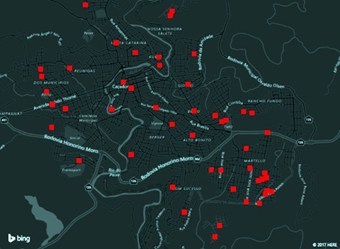 A violência contra a mulher pode ocorrer em qualquer grupo social, independente de classe social, poder aquisitivo, religião etc. O mapa abaixo mostra a incidência de casos de mulheres que buscaram a delegacia para solicitar medida protetiva e que receberam atendimento psicológico no município de Caçador. Como é possível observar, a dispersão dos pontos no mapa sugere que a violência aconteceu em praticamente todos os bairros de Caçador. No entanto, no bairro Martello é possível identificar uma concentração de casos de violência contra a mulher.