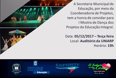 A Secretaria de Educação de Caçador realizará nesta terça-feira, 5 de dezembro, a 1ª Mostra de Dança do Município. O evento será realizado no auditório da Uniarp, a partir das 19h.
