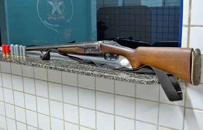 Lá chegando, os policiais logo avistaram o carro e o seguiram até o distrito de Taquara Verde, onde efetuaram a abordagem. No porta-luvas foram encontradas sete munições intactas e em baixo do assento traseiro, uma espingarda calibre 12 de dois canos, além dos dois cachorros e o farolete que estavam no porta-malas.