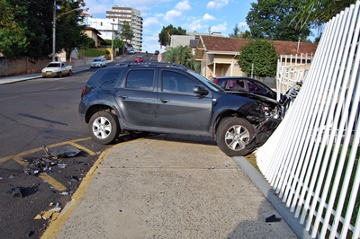 Com a força da batida, a condutora do Duster acabou perdendo o controle da direção e o veículo bateu forte contra a cerca de um edifício. O Fox ficou parcialmente danificado e parou na faixa do estacionamento ao lado do prédio.