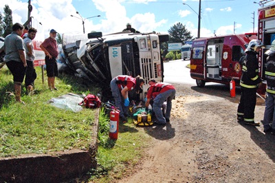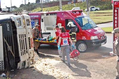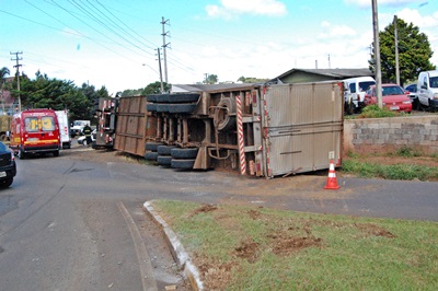Uma carreta com placas de Foz do Iguacú/PR, carregada de tecido tombou no Trevo de saída para Rio das Antas, na tarde desta quinta-feira, 15 de fevereiro. O motorista foi socorrido pelos bombeiros voluntários de Caçador e conduzido ao Pronto Socorro do Hospital Maicé.