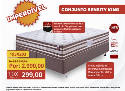 O preço do conjunto Sensity King caiu de R$ 3.390 para apenas 10x de R$ 299,00 sem juros. São R$ 400,00 de desconto! Além de molas individuais, o colchão conta com troca de ar, tornando a temperatura mais agradável e melhorando a qualidade do sono.