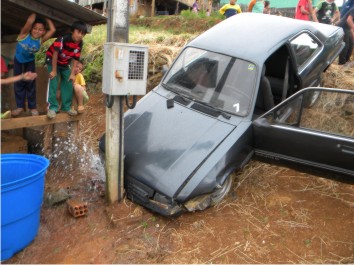 De acordo com Claudecir Oliveira, 36 anos, que conduzia o GM Chevette placas LZS-6629 de Santa Cecília, o veículo ficou sem controle, e desceu um barranco, caindo no terreno de uma igreja.