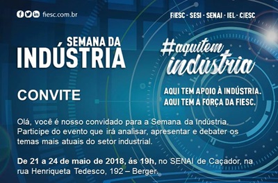 Na semana em que se celebra o Dia da Indústria (25 de maio) as entidades que integram a Federação das Indústrias de Santa Catarina (FIESC) realizam programação especial nas 16 vice-presidências. Diversas Unidades do SESI, SENAI e IEL terão programação especial para esta semana comemorativa, são palestras, workshops e apresentação de trabalhos desenvolvidos pelos alunos.
